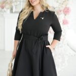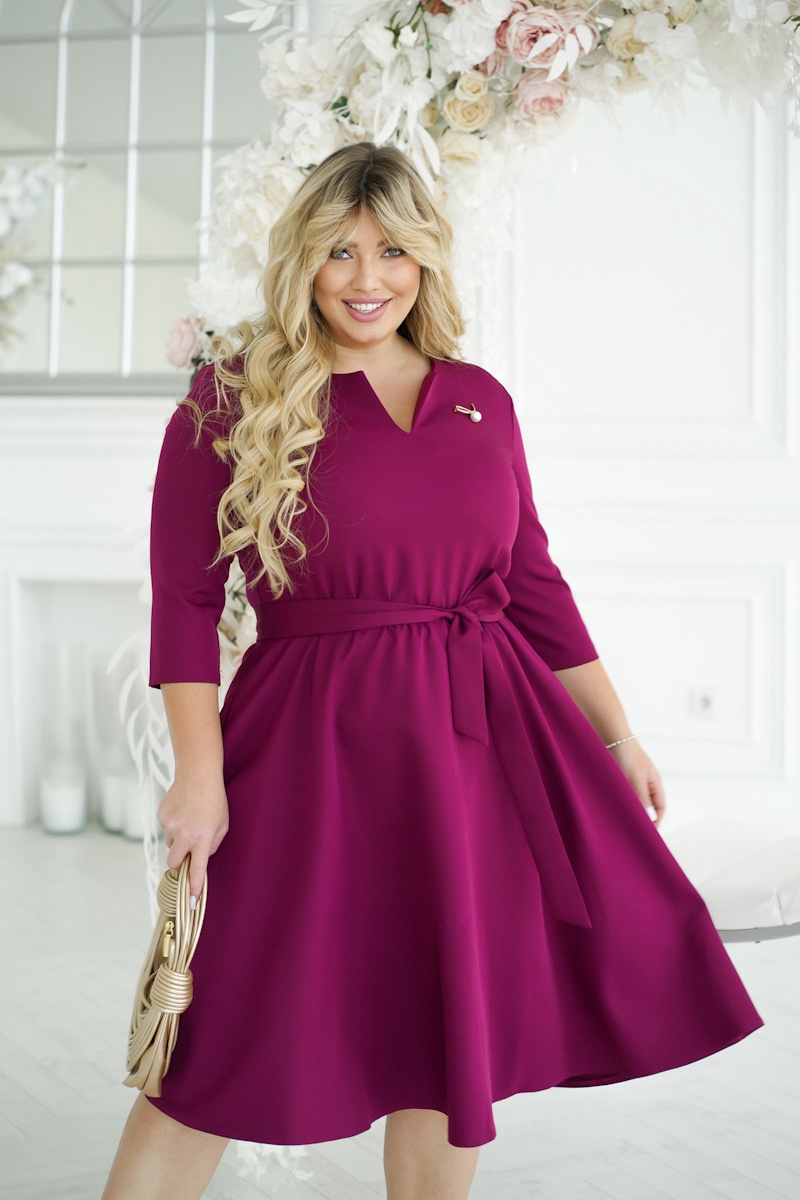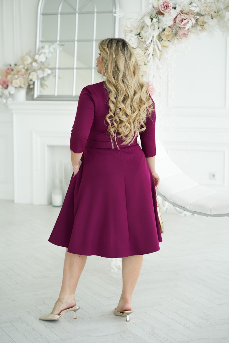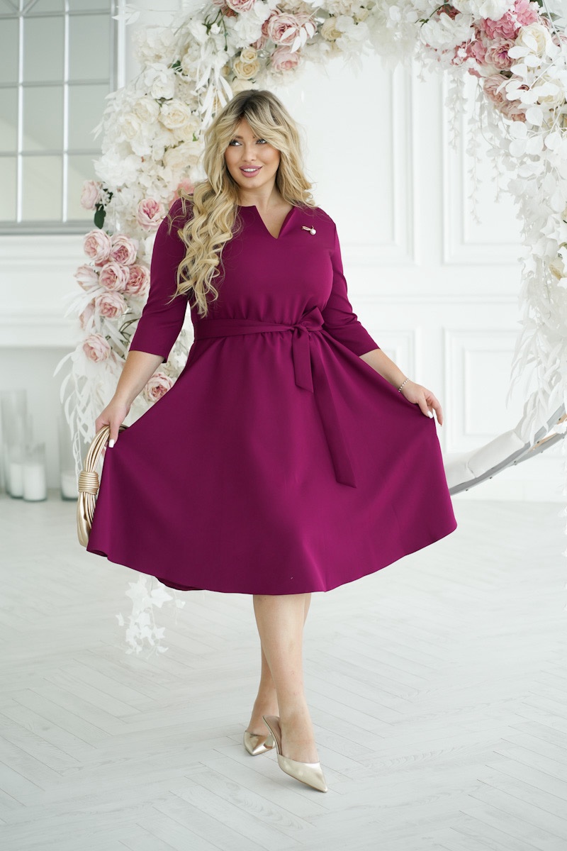 Damska sukienka midi w kolorze bordowym, której góra ma delikatny dekolt w kształcie litery V i rękawy o długości 3/4. W talii wiązany jest pasek, który tworzy subtelny akcent na sylwetce i nadaje całości smukłości. Spódnica sukienki lekko rozszerza się ku dołowi, dodając dynamiki i lekkości. Całość dopełnia mała broszka na piersi, która dodaje nutki wyrafinowania i dopełnia stylizację.