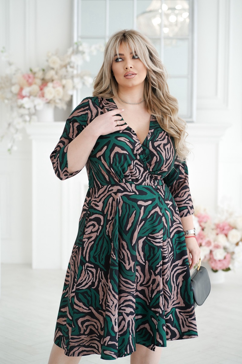 Elegancka damska sukienka wykonana jest z tkaniny z oryginalnym abstrakcyjnym wzorem w zielonych i beżowych odcieniach. Model o długości midi, z rękawami o długości 3/4. Góra sukienki z głębokim dekoltem w kształcie litery V, który podkreśla linię dekoltu. Sukienka jest delikatnie taliowana, co tworzy piękną sylwetkę, akcentując uwagę na talii. Ta sukienka będzie doskonałym wyborem do stworzenia wyrafinowanego i kobiecego looku na każdą okazję.