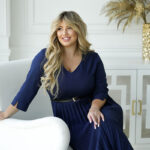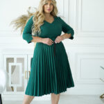 Sukienka w niebieskim kolorze z dekoltem w kształcie litery V. Górna część sukienki jest dopasowana, z rękawami o długości 3/4, które mają rozcięcia na mankietach. Sukienka jest uzupełniona czarnym paskiem, podkreślającym talię. Dolna część składa się z plisowanej spódnicy o długości midi, która nadaje stylizacji elegancji i kobiecości. Materiał sukienki jest lekki, co tworzy płynny i opływowy kształt sylwetki. Całość dopełniają klasyczne czarne buty na niskim obcasie.