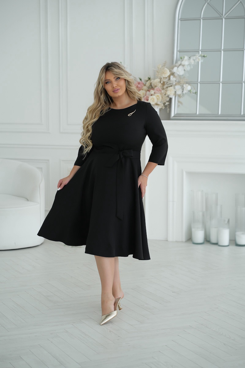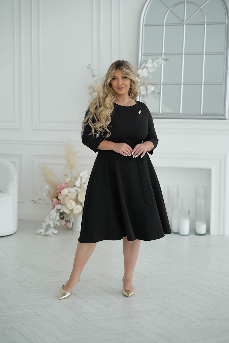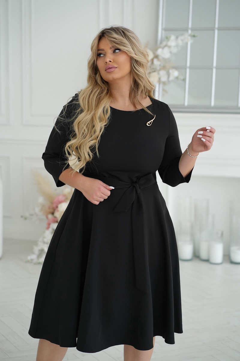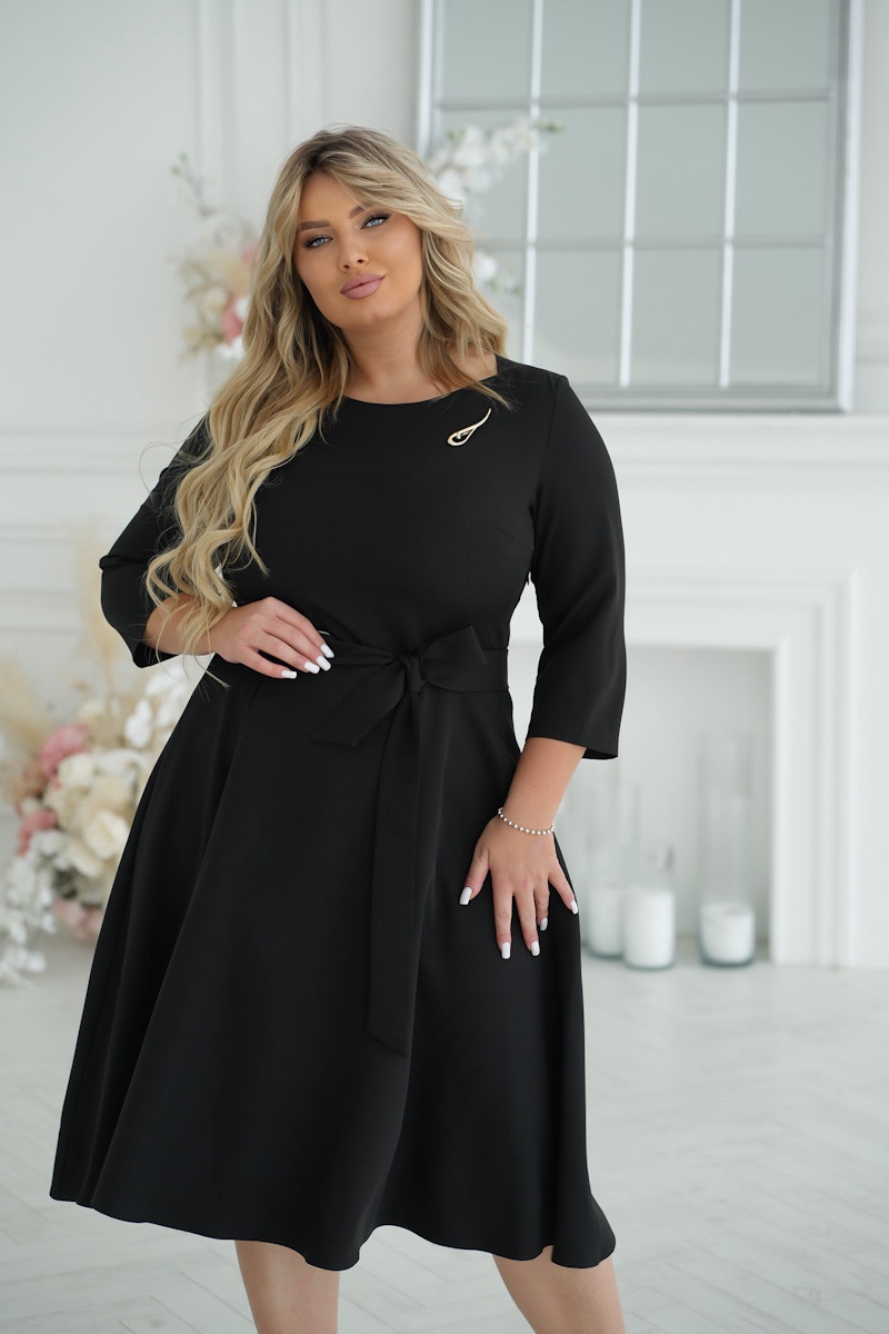 Elegancka sukienka midi w czarnym kolorze z rękawami 3/4 i okrągłym dekoltem. Na piersi sukienka ozdobiona jest stylową broszką, która dodaje uroku całej stylizacji. Pasek w talii jest zawiązany, co pozwala na regulację dopasowania i podkreślenie kobiecych kształtów. Lekki materiał nadaje sukience zwiewności i komfortu, co czyni ją idealnym wyborem na różne okazje.