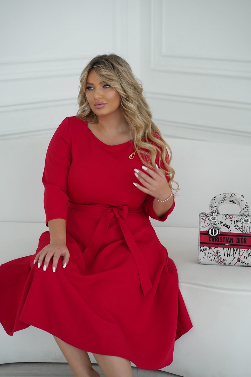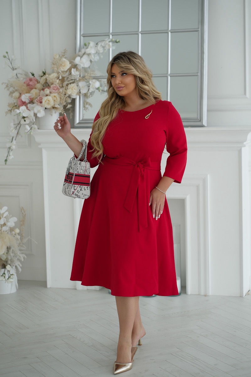 Elegancka sukienka midi w czerwonym kolorze z rękawami 3/4 i okrągłym dekoltem. Na piersi sukienka ozdobiona jest stylową broszką, która dodaje uroku całej stylizacji. Pasek w talii jest zawiązany, co pozwala na regulację dopasowania i podkreślenie kobiecych kształtów. Lekki materiał nadaje sukience zwiewności i komfortu, co czyni ją idealnym wyborem na różne okazje.