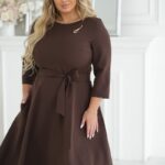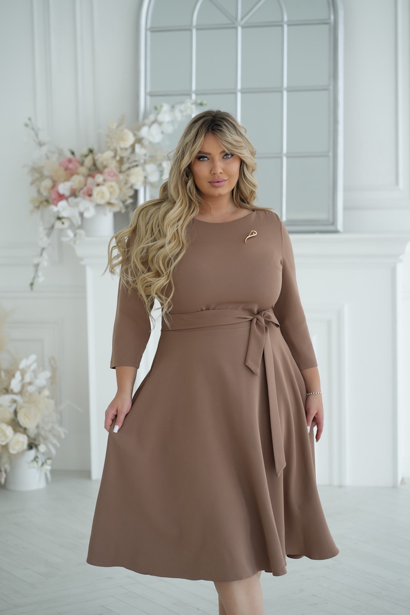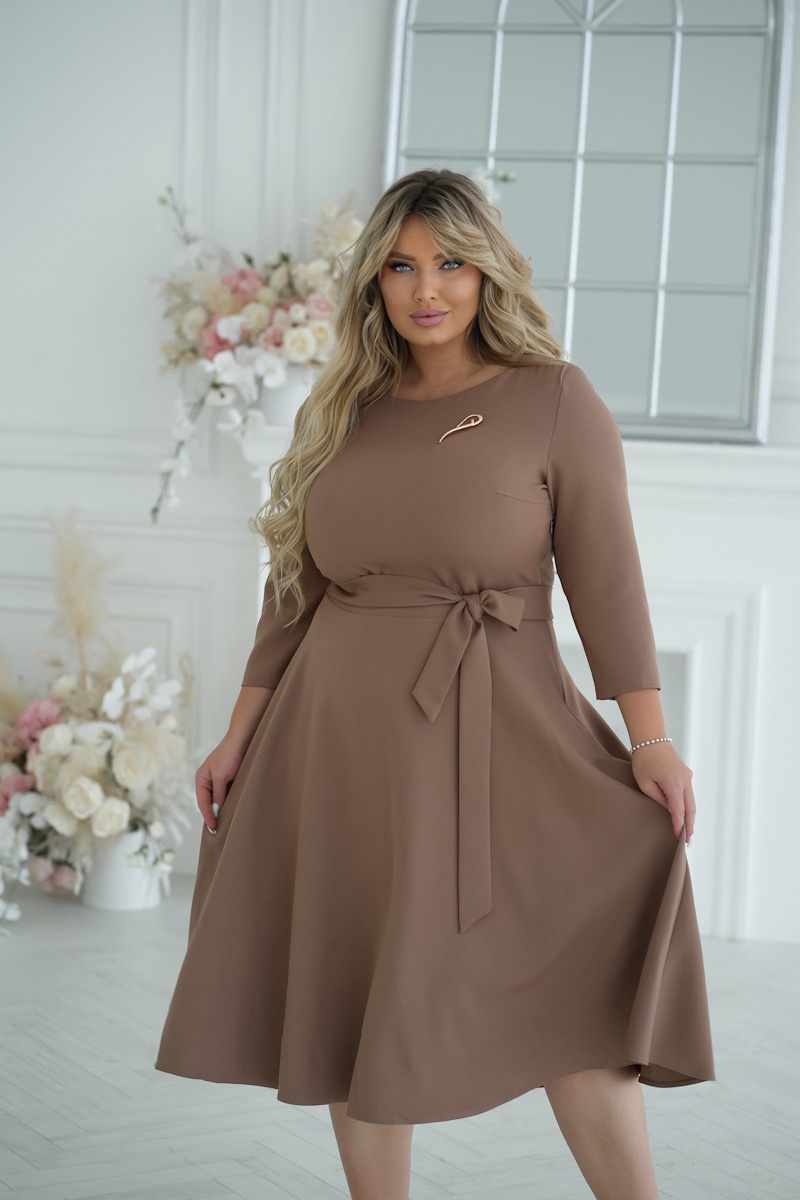 Elegancka sukienka midi w beżowym kolorze z rękawami 3/4 i okrągłym dekoltem. Na piersi sukienka ozdobiona jest stylową broszką, która dodaje uroku całej stylizacji. Pasek w talii jest zawiązany, co pozwala na regulację dopasowania i podkreślenie kobiecych kształtów. Lekki materiał nadaje sukience zwiewności i komfortu, co czyni ją idealnym wyborem na różne okazje.