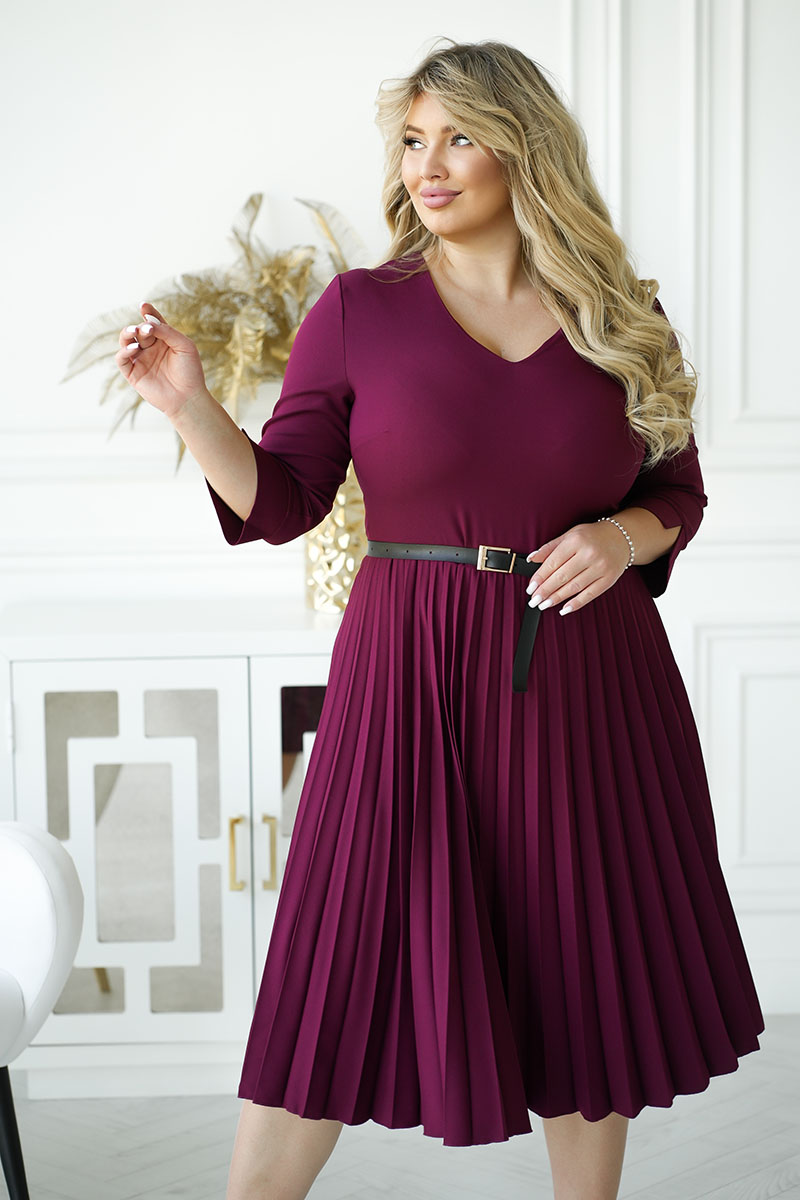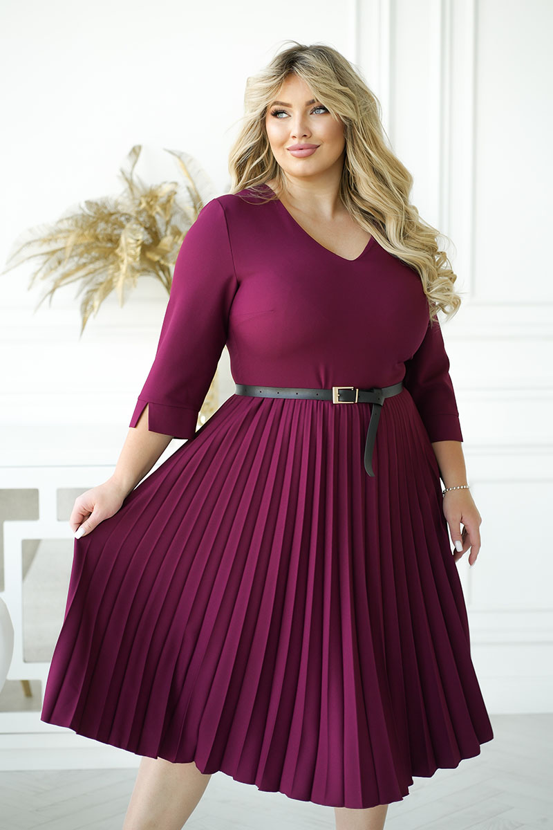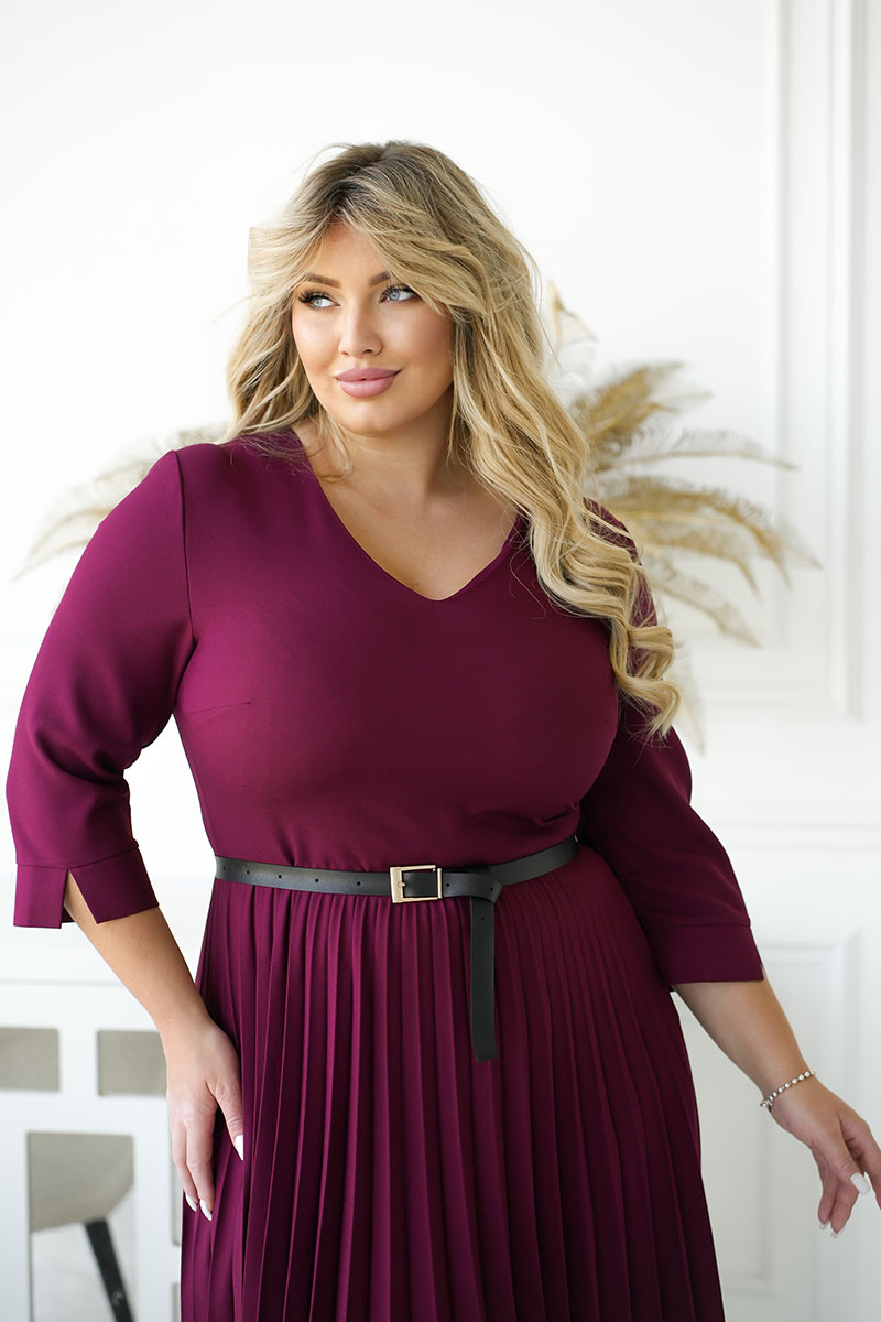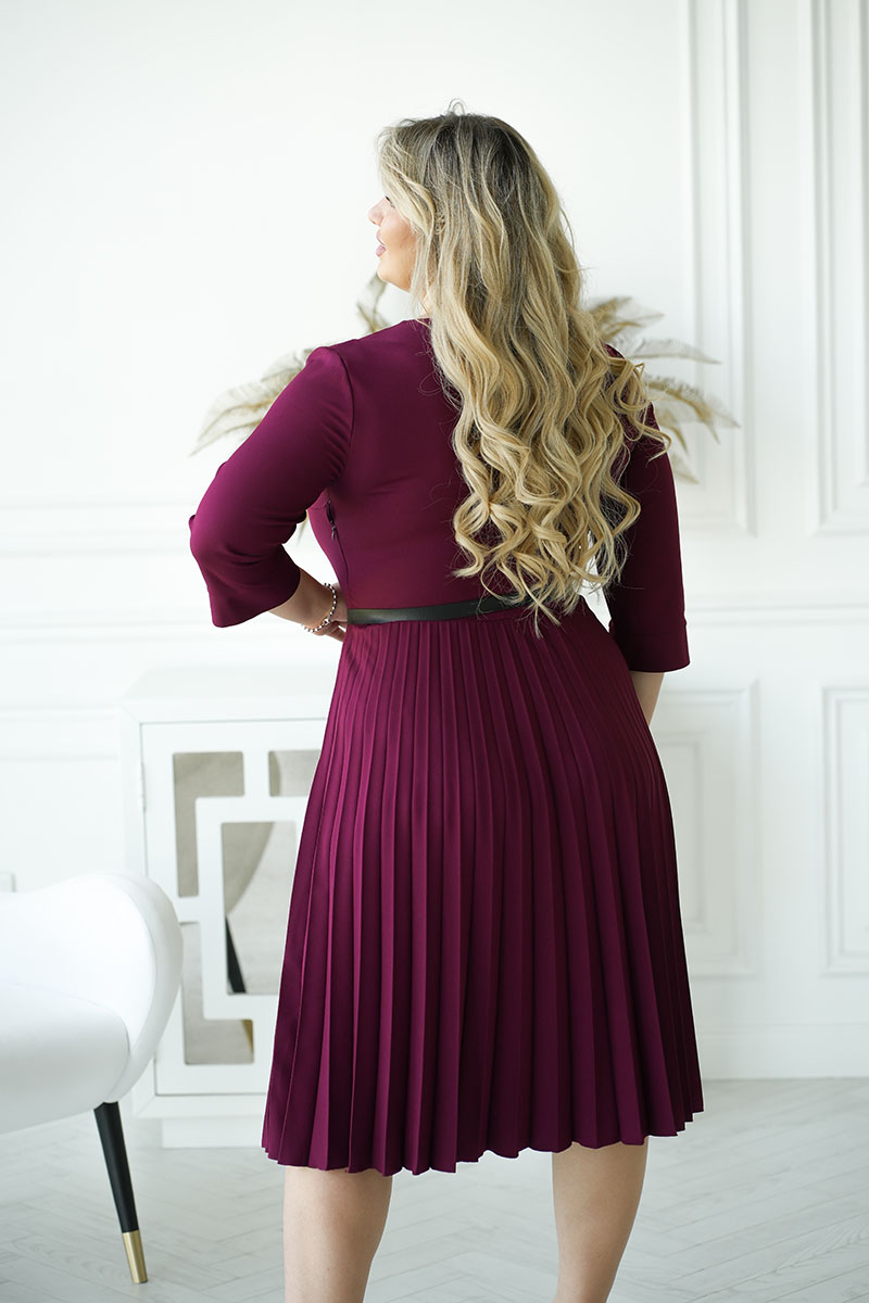Sukienka w nasyconym bordowym kolorze z dekoltem w kształcie litery V. Górna część sukienki jest dopasowana, z rękawami o długości 3/4, które mają rozcięcia na mankietach. Sukienka jest uzupełniona czarnym paskiem, podkreślającym talię. Dolna część składa się z plisowanej spódnicy o długości midi, która nadaje stylizacji elegancji i kobiecości. Materiał sukienki jest lekki, co tworzy płynny i opływowy kształt sylwetki. Całość dopełniają klasyczne czarne buty na niskim obcasie.